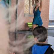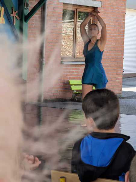 Pour ce dernier petit bout de ballade à travers le village, les participants parcourent de nouvelles voyettes, au bord de jardins où se trouvent des poules et des chèvres. Puis, après être passé devant l’église de la commune, le groupe rejoint l’école primaire. La dernière partie du spectacle raconte l’histoire et le parcours de la jeune patineuse artistique française Surya Bonaly. Une artiste dans sa discipline, fonceuse et singulière. Avec une théière, la danseuse verse de l’eau sur le tapis de sol. Puis le conteur renverse le liquide contenu dans une grande bonbonne. Sur le sol glissant, Cynthia Gallastégui propose alors un ballet liquide, doux et poétique. Elle glisse… comme une patineuse. Les spectateurs sont époustouflés par cette prestation.