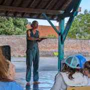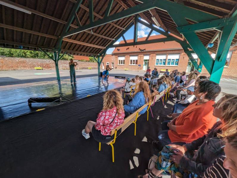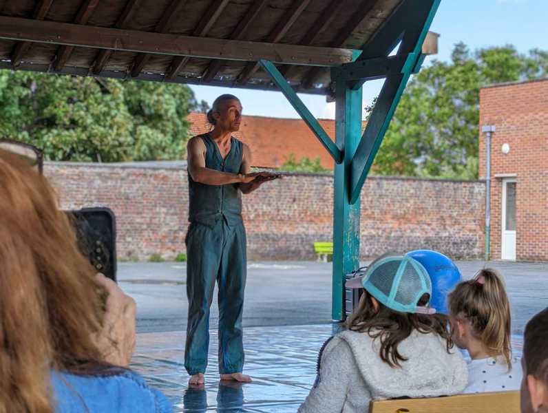 Ce dimanche 10 septembre à Fressain, l’été se prolonge intensément : il fait déjà chaud durant la matinée pendant laquelle est proposée cette balade/spectacle qui va durer plus de deux heures. Depuis octobre 2022, la compagnie Myriam Dooge est en résidence sur le territoire de cette petite commune de 900 habitants. Elle propose son spectacle À ciel ouvert ! dans un format inhabituel : quatre courts impromptus de dix/quinze minutes dans différents lieux du village entrecoupés de balades.