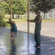 Sur cette pelouse, les deux interprètes racontent maintenant l’histoire de Yusra et Sarah Mardini, deux sœurs syriennes. Fuyant leur pays en guerre, elles traversèrent la Méditerranée. Le moteur de leur canot pneumatique tomba en panne. Mais les deux jeunes femmes étaient des nageuses confirmées. Pendant trois heures, elles vont tirer le bateau dans l’eau et sauver de la noyade la vingtaine de personnes qui s’y trouvait. Plus tard, alors qu’elle était réfugiée en Allemagne, Yusra Mardini participa aux Jeux olympiques de Rio puis à ceux de Tokyo. Alors que ce bout de spectacle se déroule à côté de chez eux, des voisins du lotissement, curieux, se rapprochent et commencent à regarder eux aussi.
